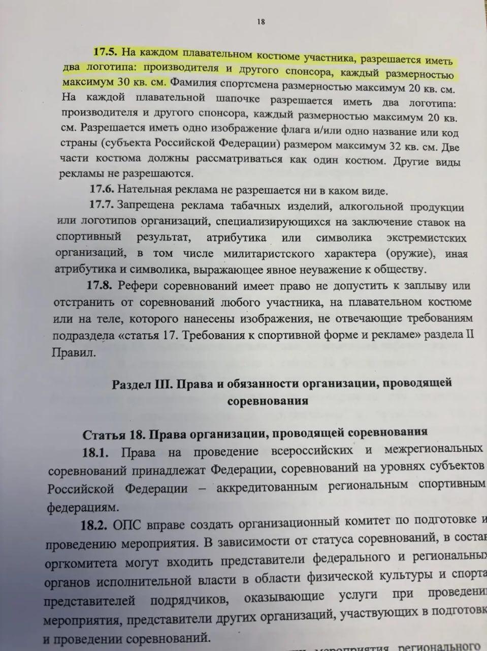 При этом в регламенте соревнований используется иная формулировка: «На каждом плавательном костюме участника разрешается иметь два логотипа: производителя и другого спонсора, каждый размерностью максимум 30 квадратных сантиметров».