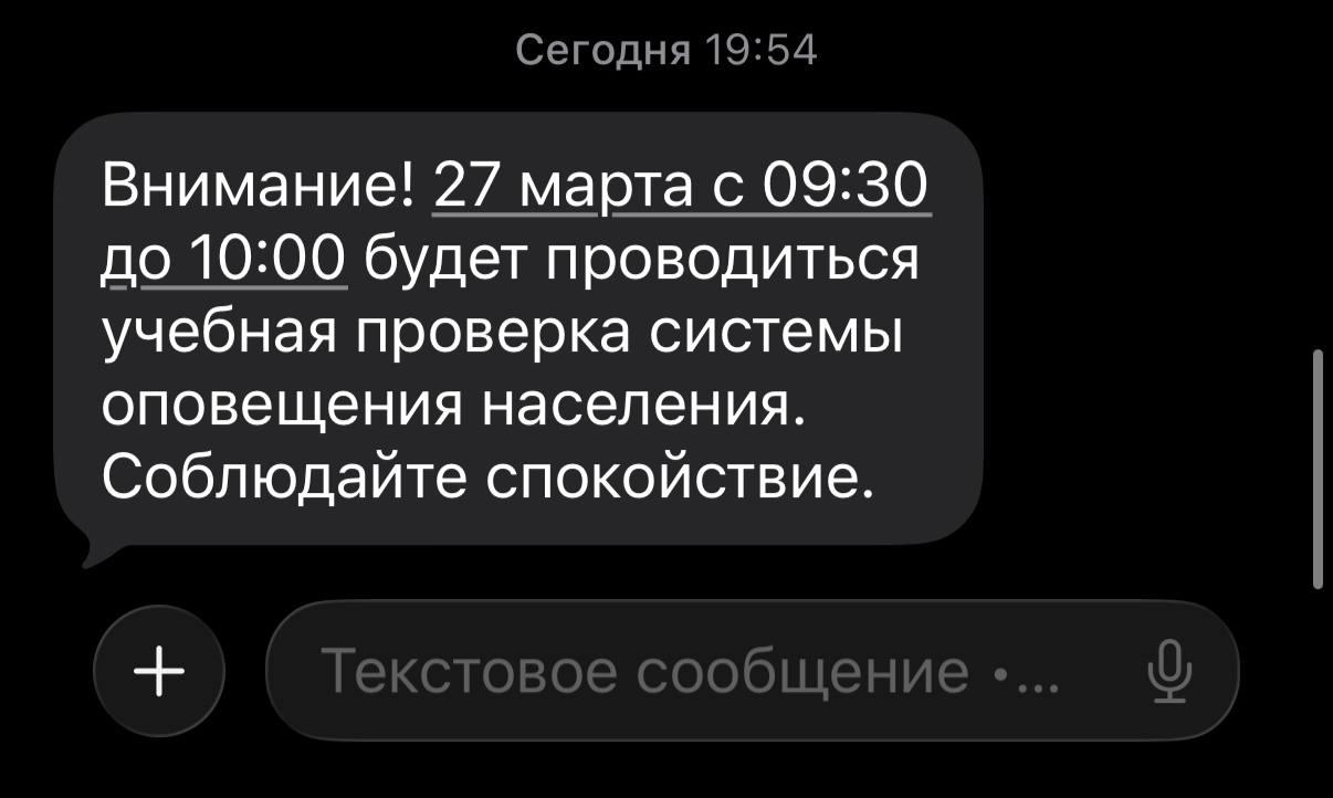 Сообщение содержало следующий текст: «Внимание! 27 марта с 09:30 до 10:00 будет проводиться учебная проверка системы оповещения населения. Соблюдайте спокойствие».