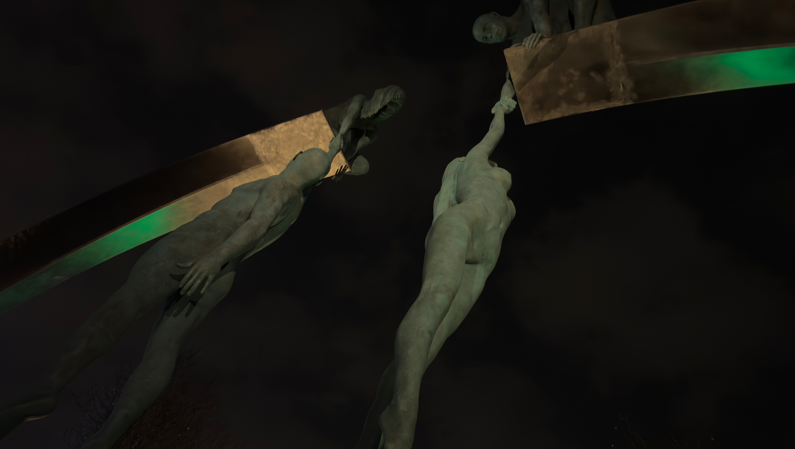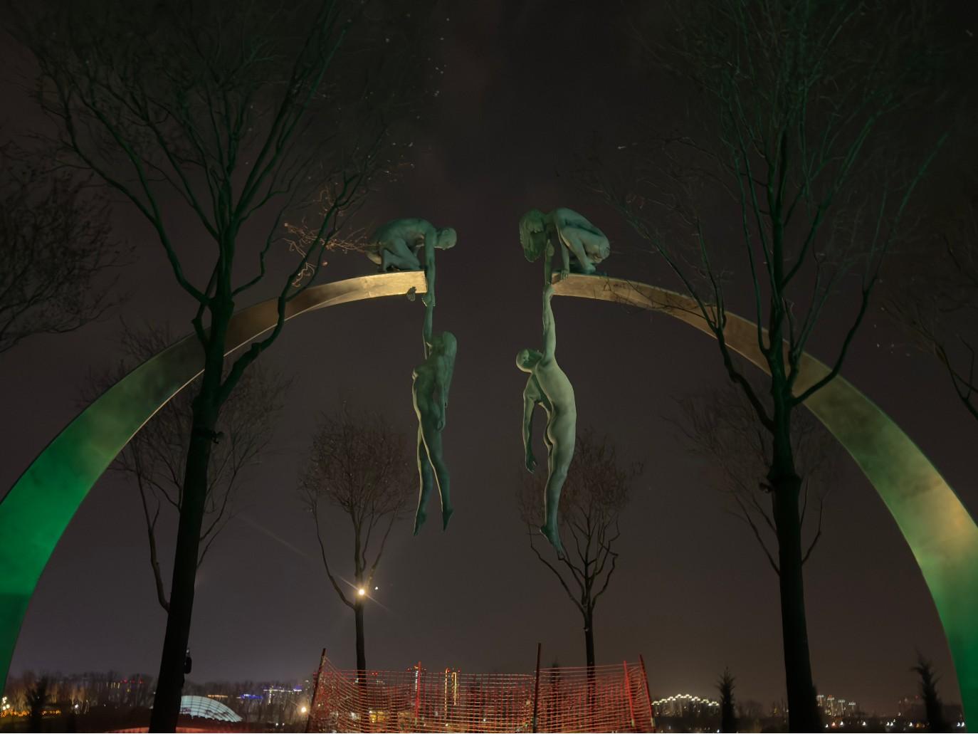 Композиция изображает людей, держащих друг друга над пропастью.