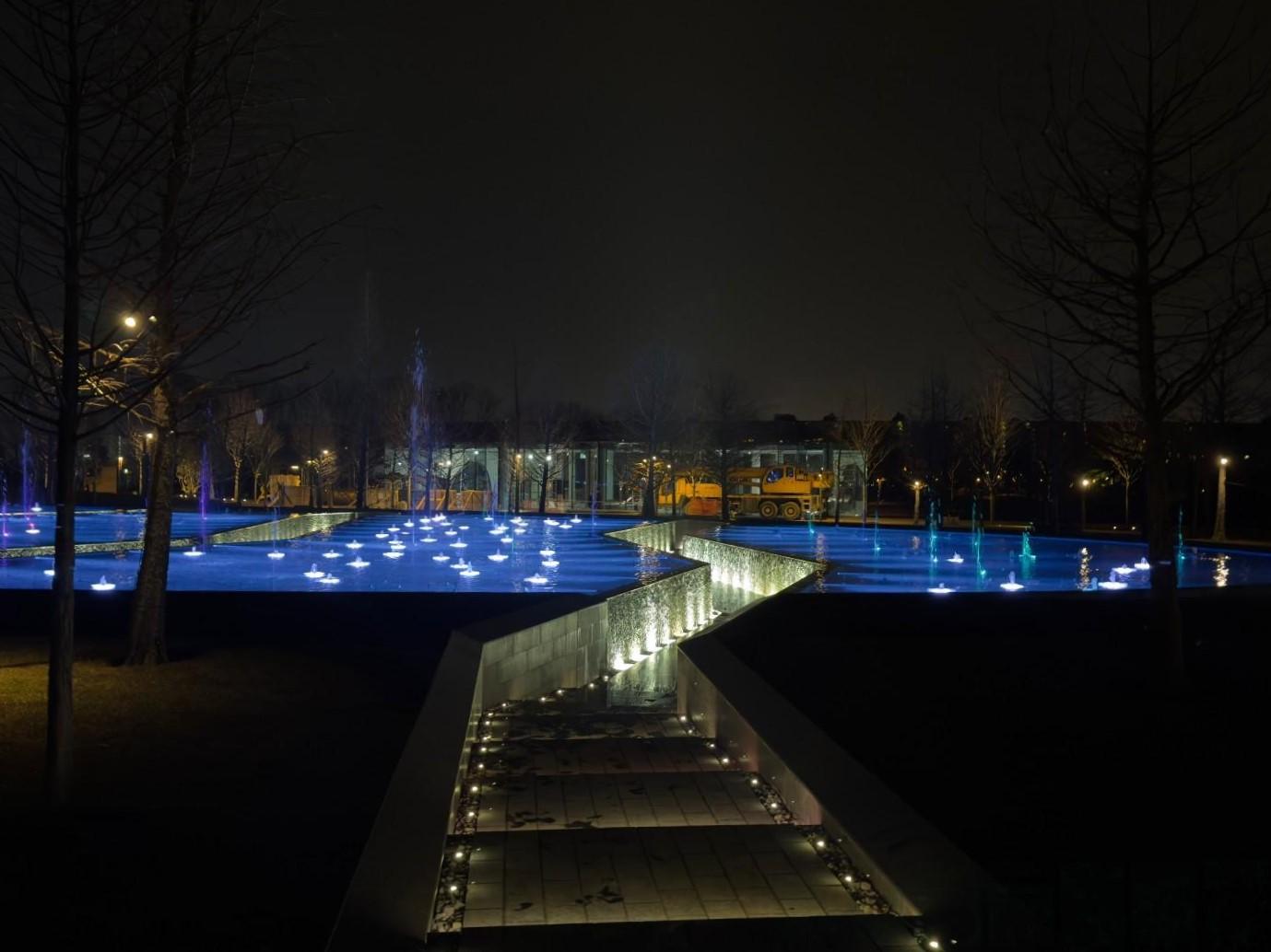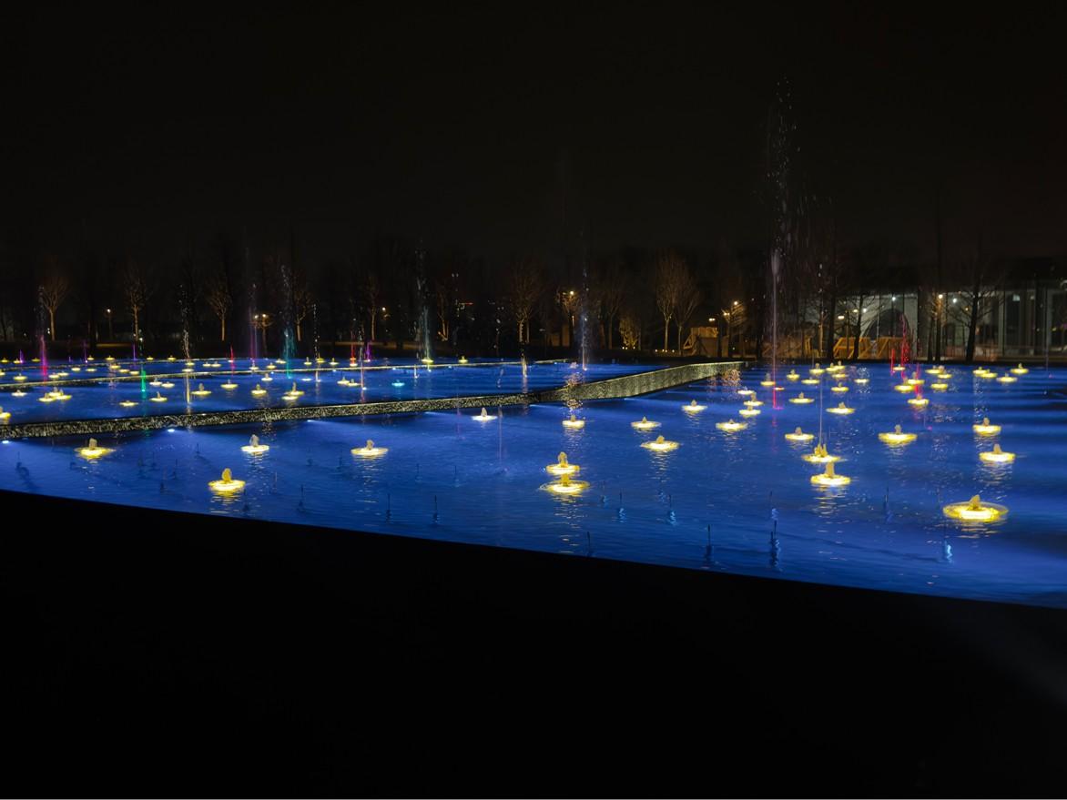 В воде установлено множество небольших фонтанчиков.
