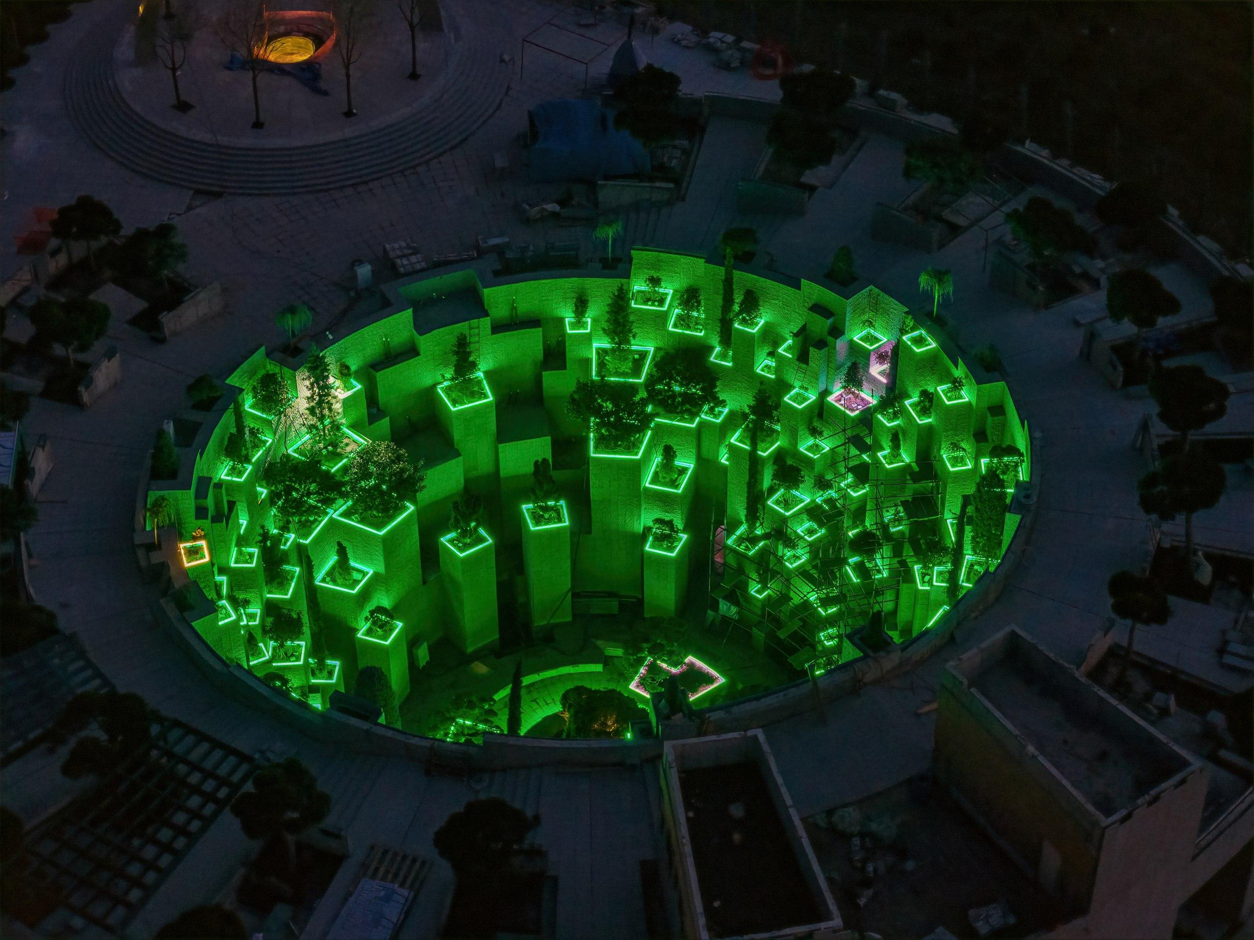 Локация включает глубокую круглую чашу, уходящую вниз на несколько уровней. В ней установлены узкие прямоугольные пилоны разной высоты, формирующие подобие «каменного каньона». В нишах между пилонами размещены десятки растений, а по верхним граням проложена подсветка.