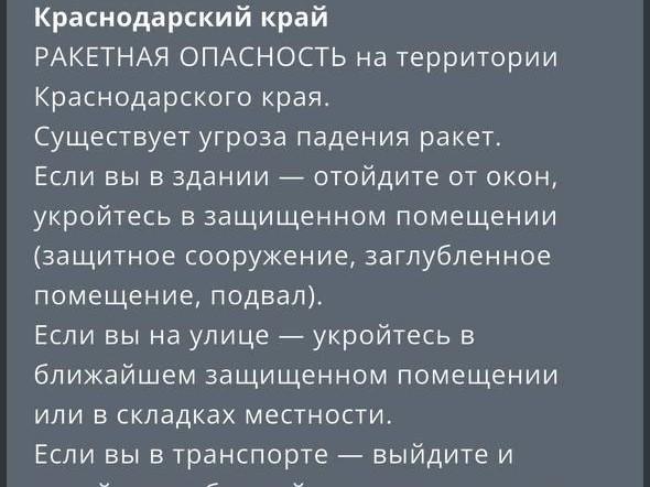 В Краснодарском крае объявили о ракетной и беспилотной опасности. Жителям рекомендуют укрыться в безопасных местах из-за угрозы падения.