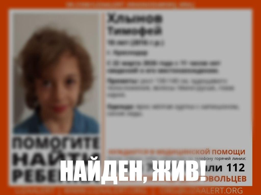 Поисковый отряд «ЛизаАлерт» распространил информацию об исчезновении 10-летнего Тимофея Хлынова в Краснодаре 22 марта. По сведениям пресс-службы УМВД, мальчик ушел из дома в поселке Краснодарском приблизительно в 10:30, и с тех пор о нем ничего не известно.