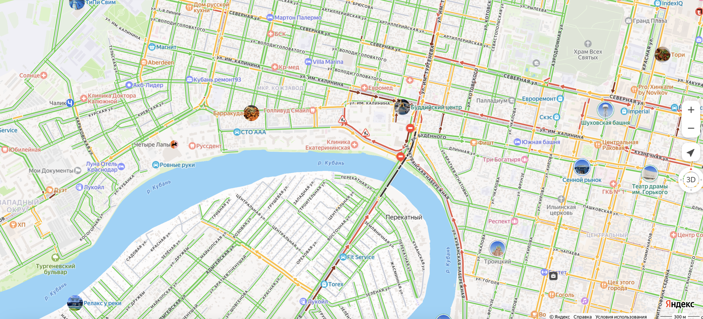 16 марта утренние часы пик в Краснодаре ознаменовались серьёзными затруднениями движения на Кубанской Набережной из-за начавшегося ремонта участка Кожевенной улицы от набережной до Скорняжной.